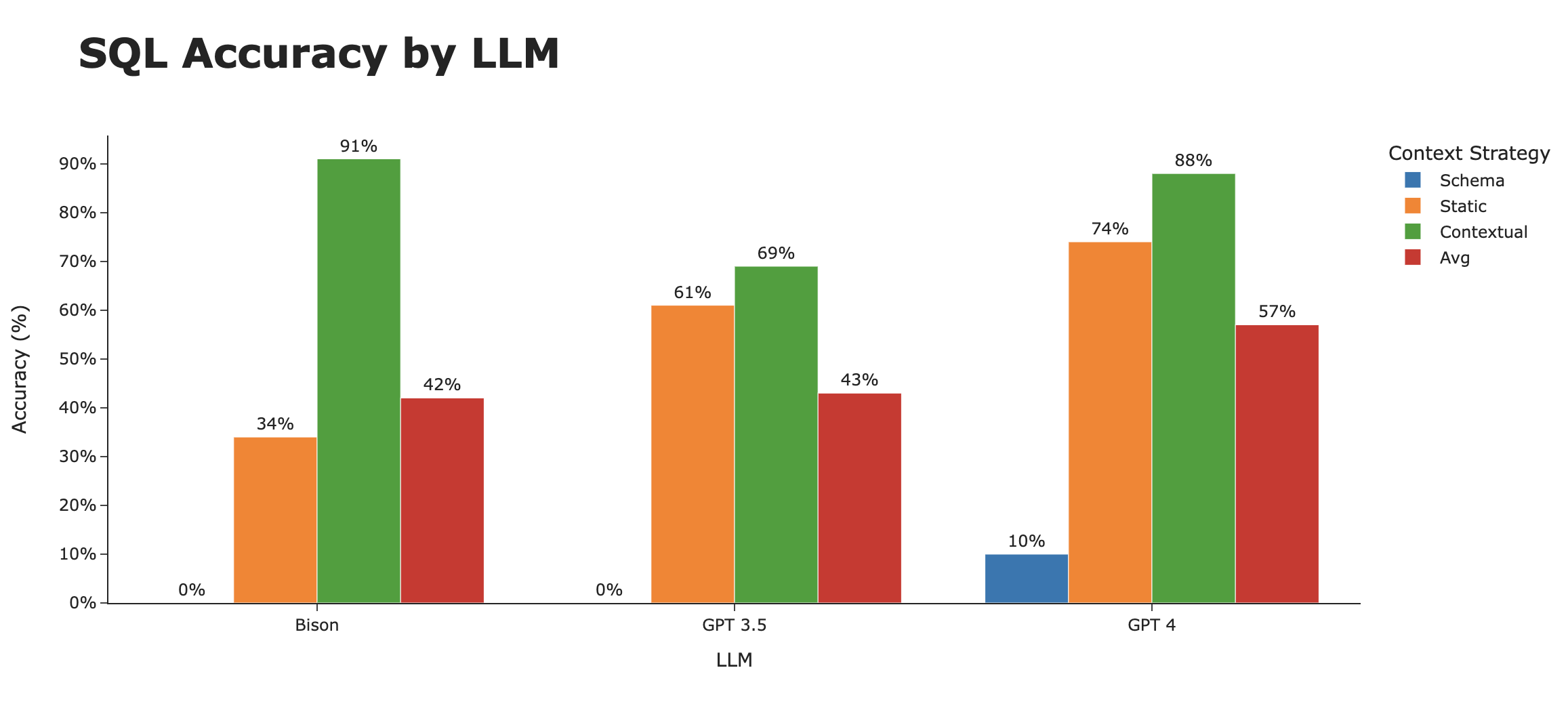 LLM本身仍然有一些有趣的趋势。虽然Bison在仅模式和静态上下文策略中都处于垫底位置,但在完整的上下文策略下却一跃成为顶尖。平均来看,在三种策略中,GPT 4荣膺SQL生成的最佳LLM。