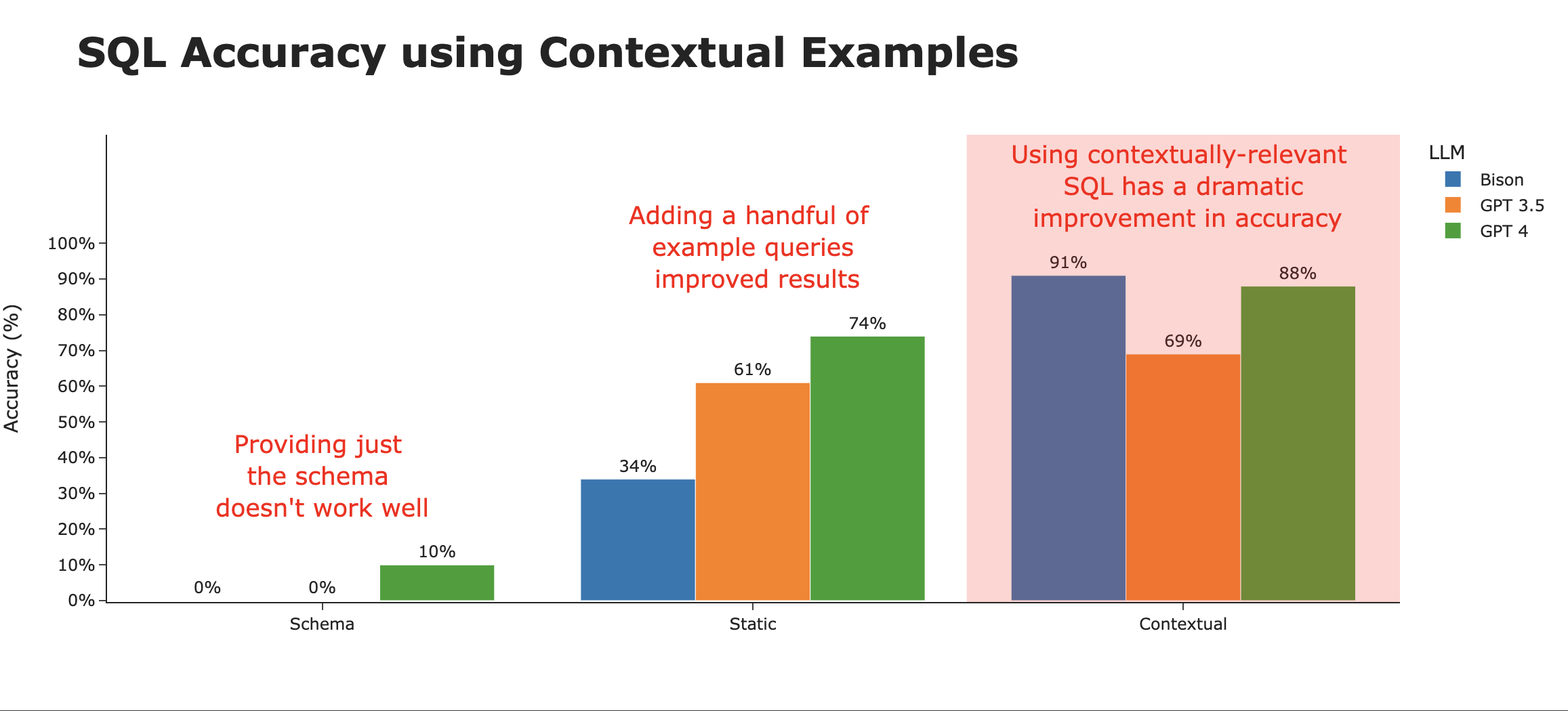 当我们按上下文策略查看SQL准确率时,很明显这就是造成差异的原因。仅使用模式时准确率约为3%,而智能地使用情境相关示例时,准确率可达约80%。