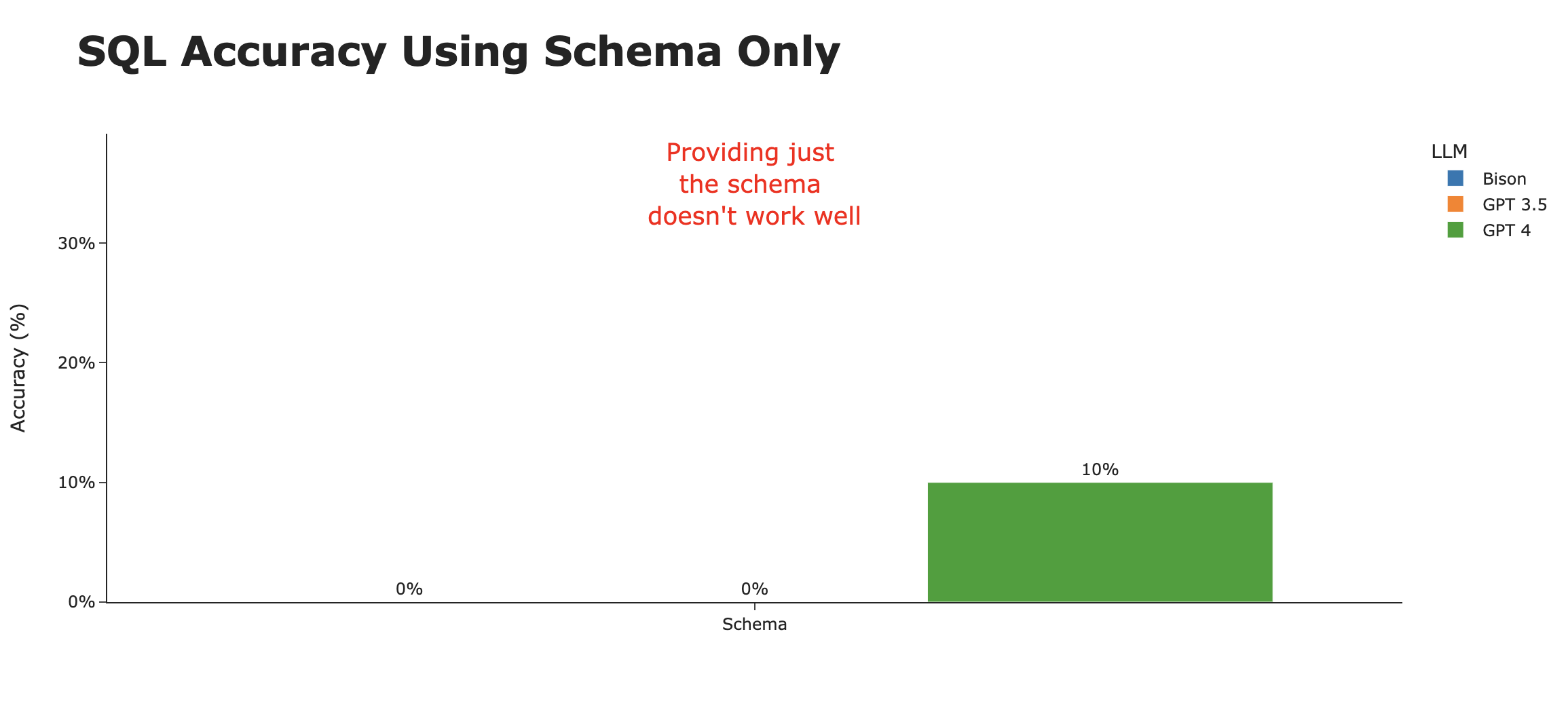 我们还比较了几种不同的LLM,包括Google Bison、GPT 3.5、GPT 4,并简要尝试了Llama 2。虽然GPT 4在生成SQL方面总体上表现最佳,但当提供足够的上下文时,Google的Bison大致相当。