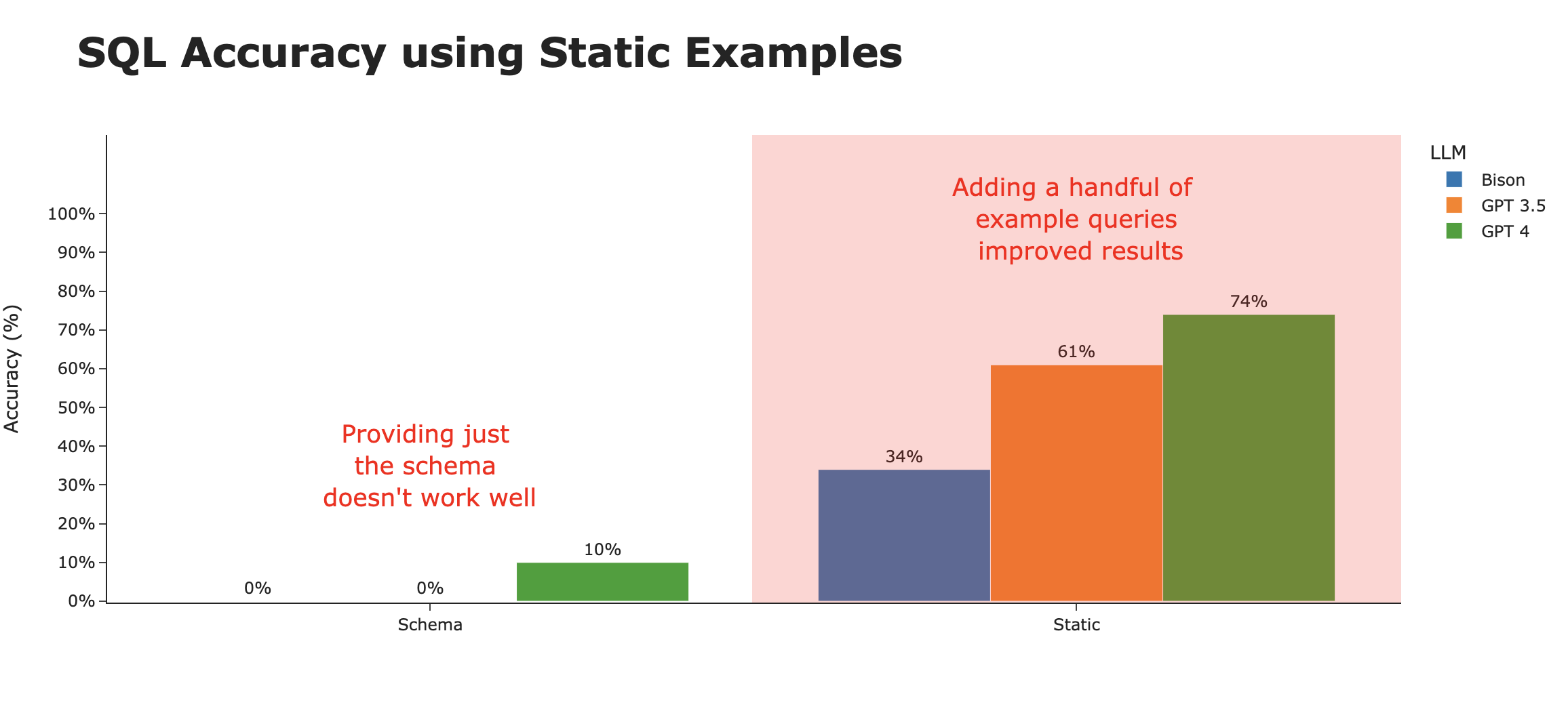 仅通过提供这3个示例查询,我们看到生成的SQL的正确性有了显著提高。然而,准确性因底层LLM而异。似乎GPT-4最能以生成最准确SQL的方式泛化示例查询。