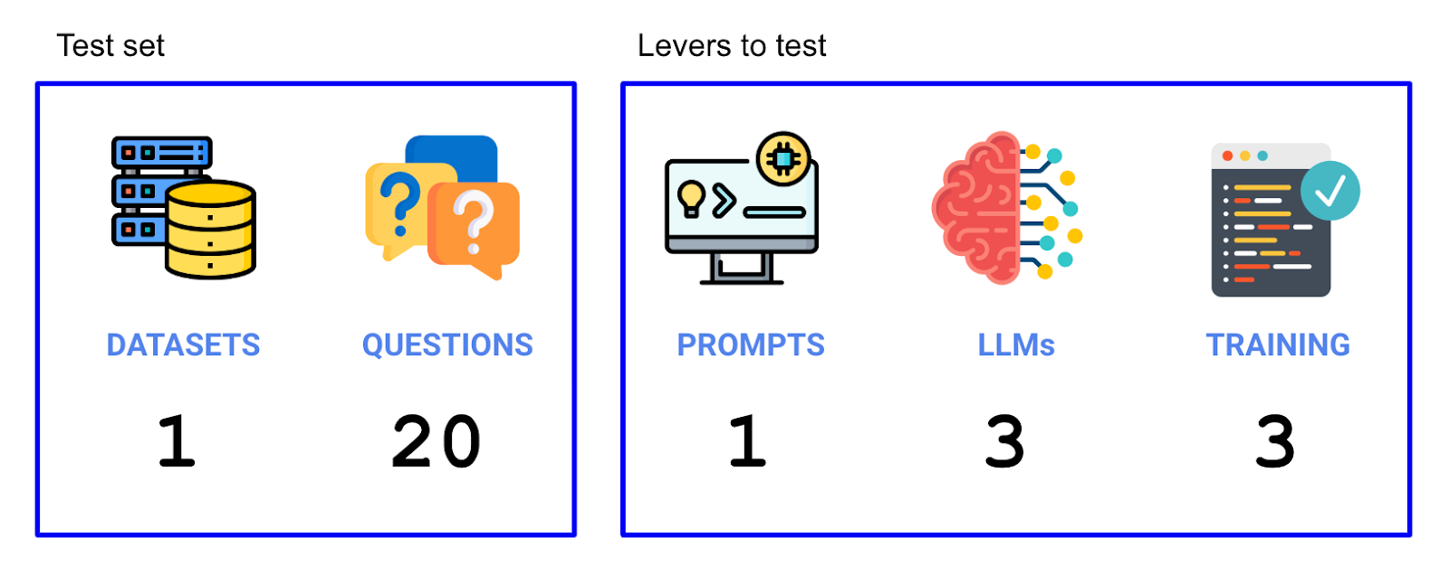 现在我们的实验已经设置好,我们需要确定哪些因素会影响准确性,以及我们的测试集是什么。我们尝试了两个因素(LLM和使用的训练数据),并在构成我们测试集的20个问题上进行了运行。因此,在此实验中,我们总共进行了 3个LLM x 3种上下文策略 x 20个问题 = 180个单独的试验。
