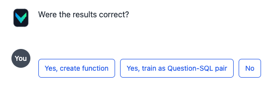 该 Web 应用程序有一个新按钮,允许您选择是将结果训练为原始的问答-SQL 对,还是将其训练为一个函数。Function RAG 将自动从问题中提取看起来像参数的内容,并使其作为函数参数可用。